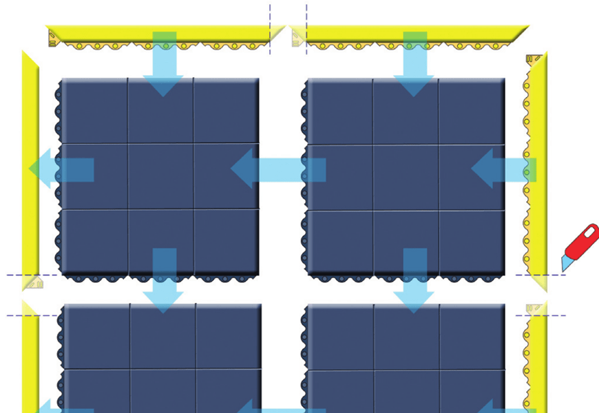 A négyzetalakú 91 x 91 cm méretű modulok könnyen összekapcsolhatók kereszt- és hosszanti irányban is, így tetszőleges felület fedhető le az adott munkaterület igényei szerint.